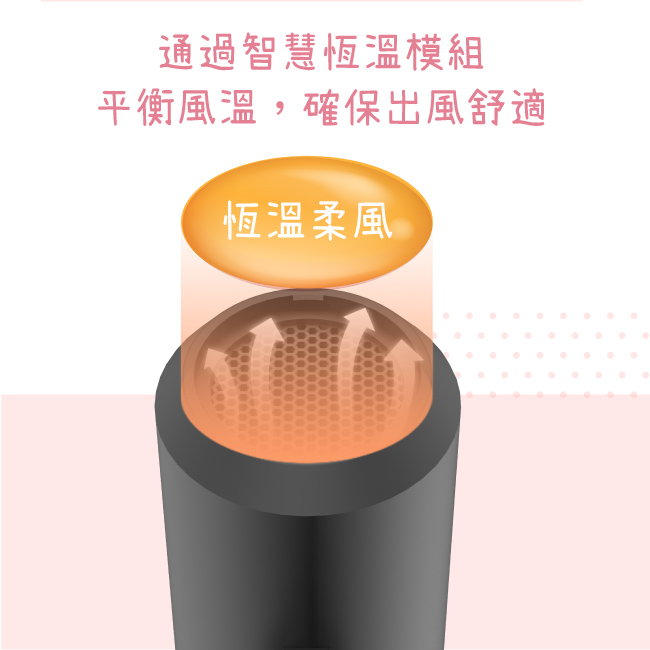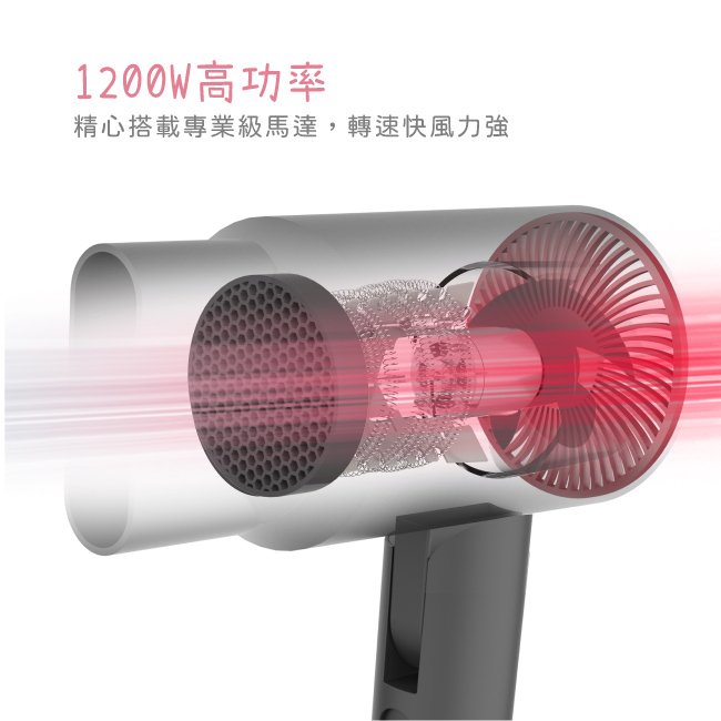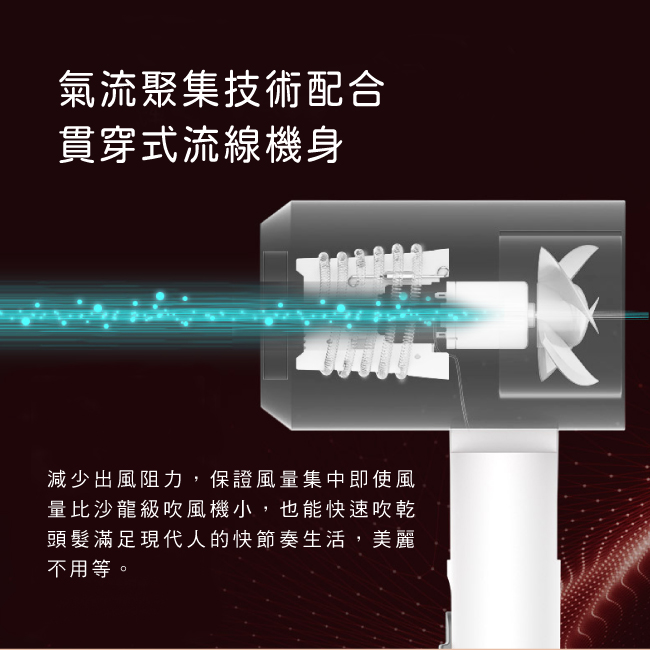 - 搭載專業級馬達,高轉速強風力,氣流聚集技術搭配貫穿式流線機身,減少出風阻力,風量集中快速吹乾頭髮。