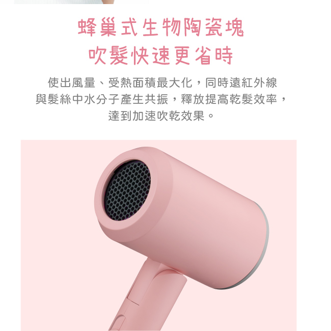 - 蜂巢式生物陶瓷塊經加熱可釋放4~14微米範圍遠紅外線,使出風溫和不燙頭皮,保護髮根不受損!