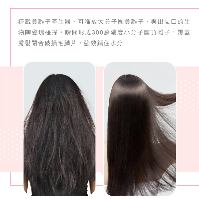 - 內置負離子產生器,可釋放高濃度大分子團負離子,與生物陶瓷塊碰撞形成百萬濃度小分子團負離子,推動水分子進入毛鱗片,同時避免靜電,滋潤髮絲不分岔,輕柔滑順不毛躁