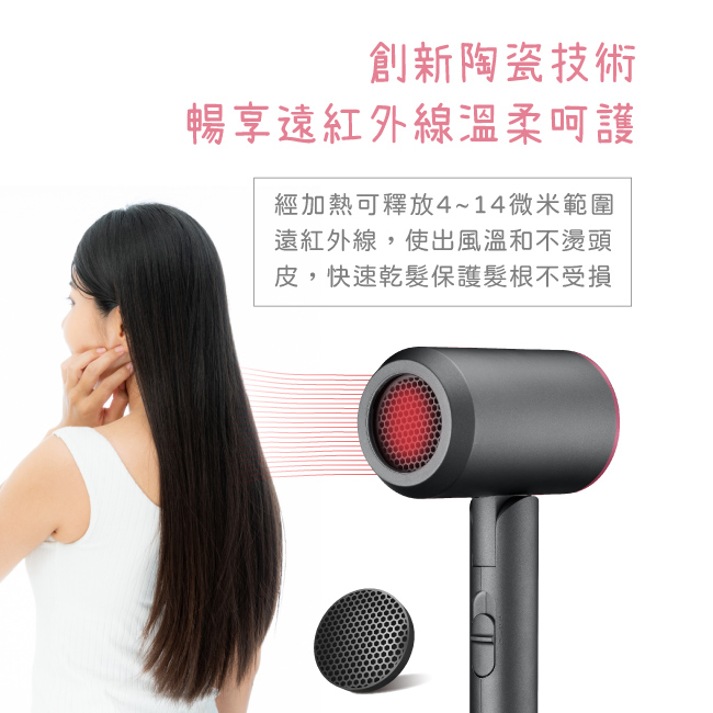 - 使出風量、受熱面積最大化,同時遠紅外線與髮絲中水分子產生共振,釋放提高乾髮效率,達到加速吹乾效果