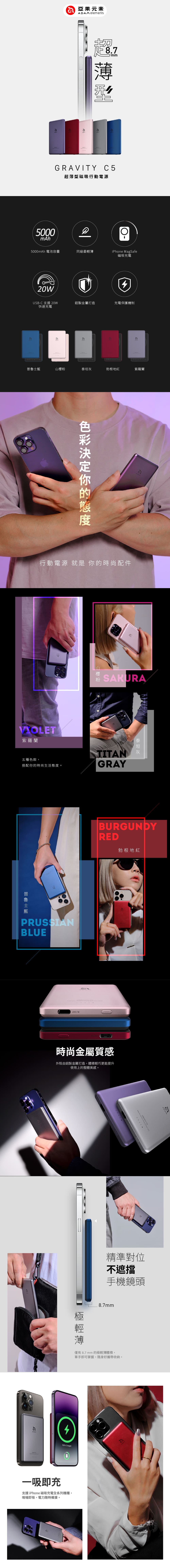 - 內建5000mAh鋰電池,搭配僅有8.7 mm的極輕薄體積,單手即可掌握,隨身好攜帶收納