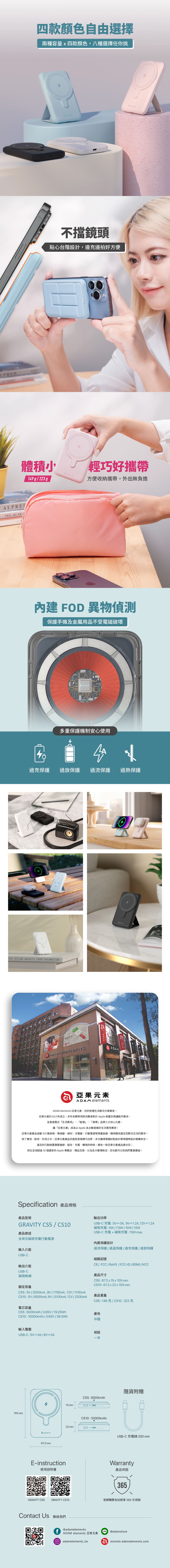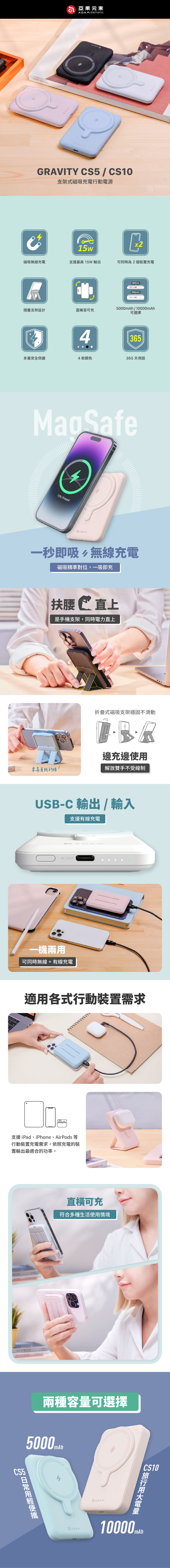- 內建10000 mAh鋰電池,配備USB-C 孔,以及使用無線充電最高可達15W (iPhone磁吸充電最高7.5W),可同時輸出一機兩用