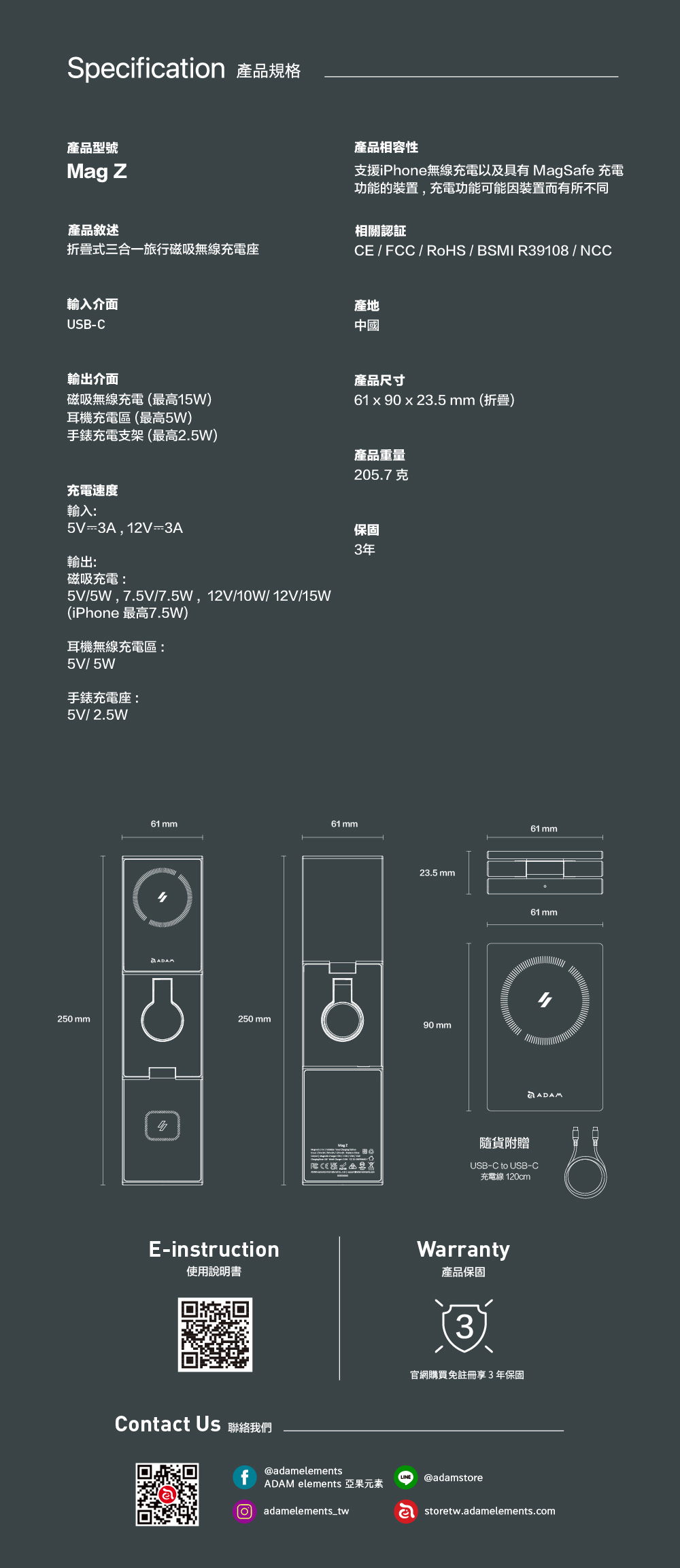 - 可折疊收納縮小體積,外出攜帶不佔空間,內附USB-C 充電線,最大可達15W充電。