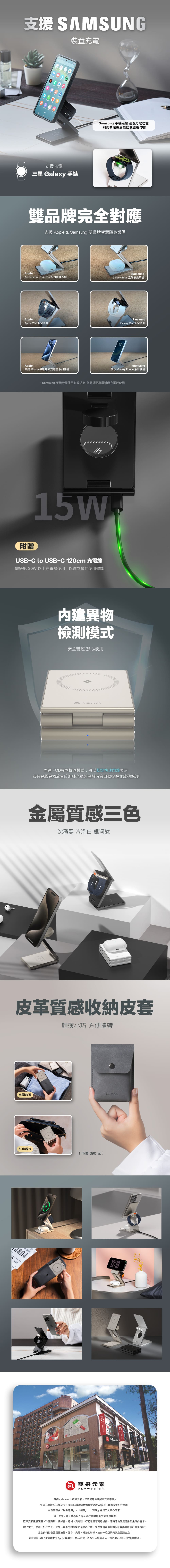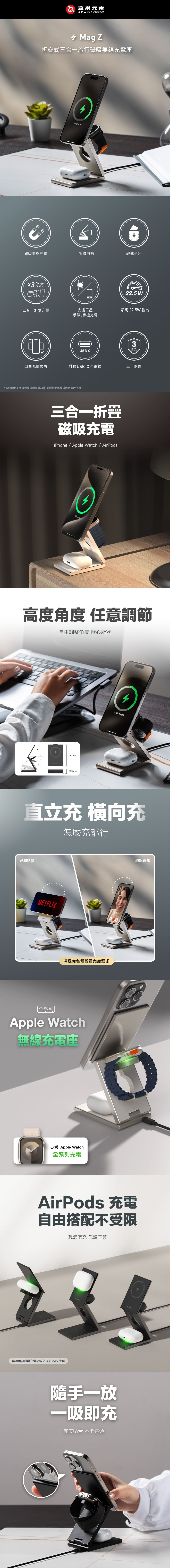 - 兼具時尚及功能性的三合一設計,同時為你的iPhone.Apple Watch, 三星Galaxy 手錶 提供快速充電,以及AirPods充飽電。