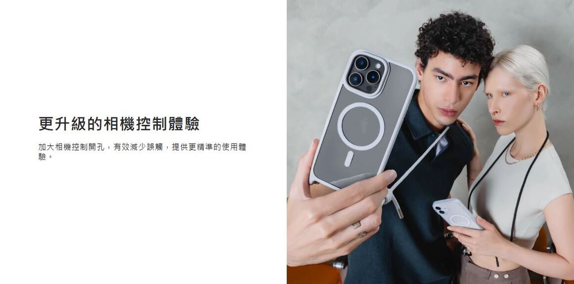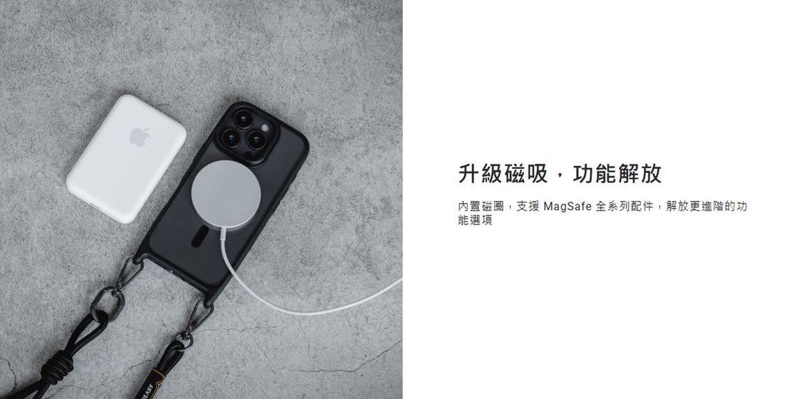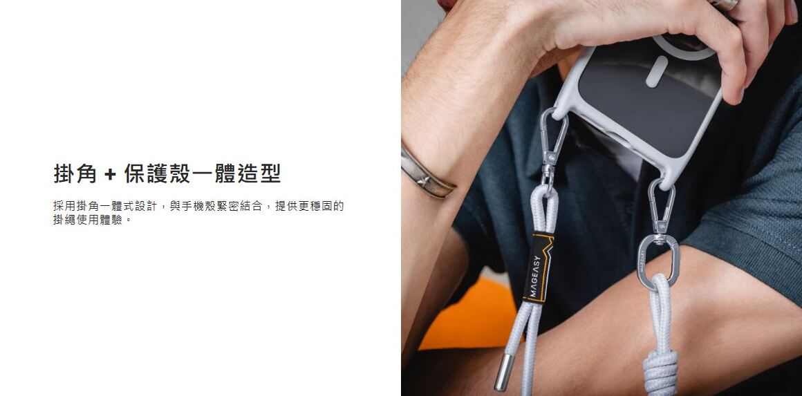 - 掛角 + 保護殼一體造型:採用掛角一體式設計,與手機殼緊密結合,提供更穩固的掛繩使用體驗。