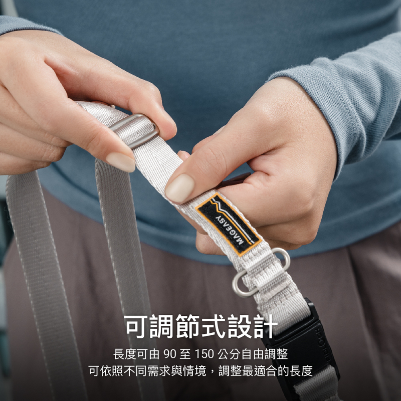 長度可由 90 至 150 公分自由調整,可依照不同需求與情境,調整最適合的長度 - 雙扣設計 百搭隨行